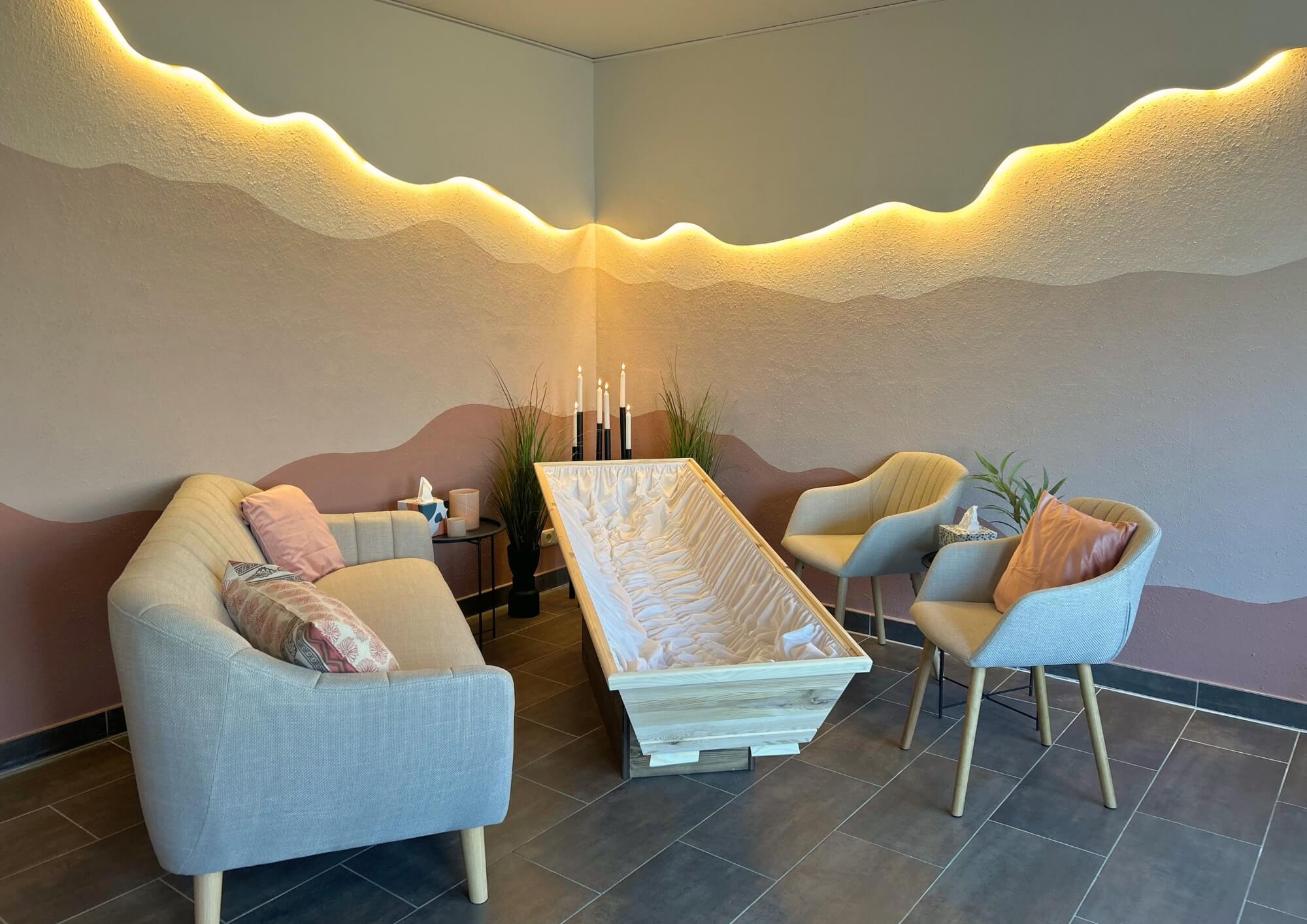 Der helle, freundlich gestaltete Raum lädt dazu ein, dem Verstorbenen noch einmal nahe zu sein. Auf Wunsch begleiten wir Sie behutsam zum offenen Sarg und stehen Ihnen dabei achtsam zur Seite.